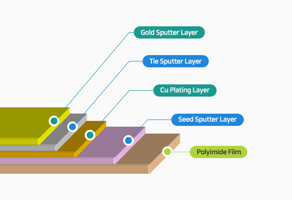 Copper foil is formed on the polyimide film through sputtering and plating, and Au is sputtered on it. It is a flexible film that is used as a raw material for electrically conductive contact terminals mounted on a PCB pattern or a ground pattern.