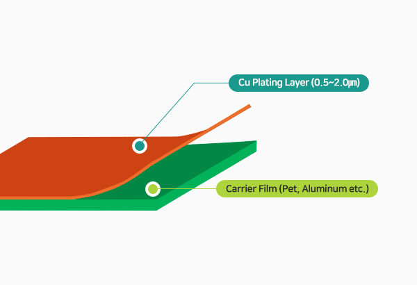 Carrier(Aluminum, PET, PI 등)가 부착된 2um 이하의 매우 얇은 동박으로 Carrier와 동박이 분리되는 것이 특징으로 반도체 Package, 고속전송 Board용의 원재료로 사용된다.